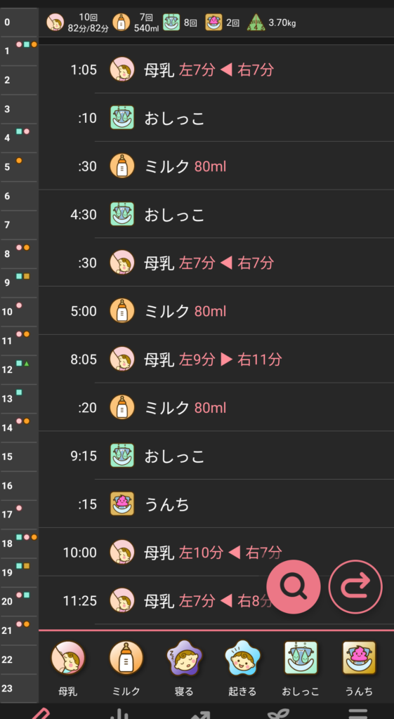 何時にミルクをどのくらいあげたのか、いつおしっこをしたかなど、へとへとで忘れやすいのでかなり助かります。